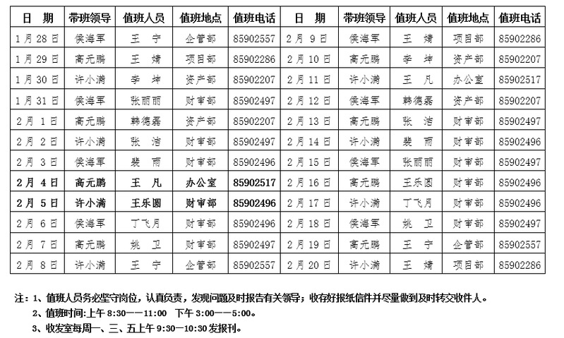 控股公司机关2019年寒期轮休值班表