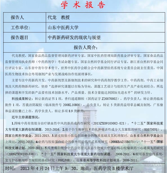 【学术报告】代龙教授:中药新药研发的现状与展望