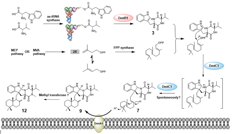 含有二酮哌嗪(DKPs)骨架的天然产物具有能跨过肠屏障和血脑屏障等特点,是重要的药物先导化合物。DKPs的生物合成分为非核糖体肽合酶(NRPSs)和环二肽合酶(CDPSs)两类。目前报道的DKPs主要是通过NRPS途径合成,而CDPS途径是一种与NRPS截然不同的途径。课题组人员采用基因组采掘技术,从三株链霉菌中发现了3个含有CDPS的同源基因簇dmt1-3。体内实验显示DmtB1是首个以cyclo-(L-Trp-L-Val)为主产物的CDPS,能够合成cyclo-(L-Trp-L-Xaa) (Xaa= Val, Pro, Leu, Ile和Ala) 5个产物,对第二个氨基酸的选择性较低,而DmtB2和DmtB3只产生1-2种环二肽,对第二个氨基酸的选择性较强。采用异源表达手段研究了dmt1-3的编码产物,通过体内基因阻断、互补和高表达等遗传操作解析了各个基因的功能,发现了首个具有底物宽泛性的PSL家族异戊烯基转移酶和通过双键质子化起始环化反应的细菌源膜结合萜环化酶,揭示了tRNA依赖型DKP-萜类化合物生物合成机制(图1)。该发现为采用组合生物合成技术开展DKPs类化合物结构多样性研究提供了重要的科学理论指导。