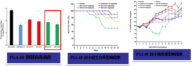 PGA-68体外抗IAV 活性的IC50=57.5μM,是阳性对照利巴韦林的2倍(阳性药利巴韦林IC50=102.5μM)。 在体内灌胃给药小鼠肺炎模型评价中,给药剂量为2.5 和5 mg/kg/day的情况下,PGA-68能显著提高小鼠肺指数。小鼠的肺指数(37.5%和41.2%)(P<0.01),优于奥司他韦(30.9%)。在抑制肺病毒滴度、 在5 mg/kg/day时,PGA-68能显著抑制肺病毒滴度,抑制效果与阳性药物奥司他韦(10 mg/kg/day)相当。 在5 mg/kg/day时,PGA-68(295)处理组的小鼠生存率显著提高(P < 0.01),死亡保护率高达40%,与奥司他韦相当(40%)。 在2.5和5 mg/kg/day时,体重都无明显下降,一直在缓慢上升,与正常组和奥司他韦组相似。 ![]()