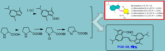 ournal of Natural Products, 2021, 84, 1345−1352. 抗病毒候选药物PGA-68规模化制备技术优化 抗流感病毒H1N1候选药物PGA-68,来自于对高领类尖柳珊瑚Muriceidescollaris获得的新骨架化合物muriceidine A [Scientific reports (2017), 7(1), 1-9] 的全合成与结构优化研究。最初的合成以愈创木薁和哌啶酸为原料,经过5步反应,以1%收率获得目标化合物PGA-68。 ![]()
