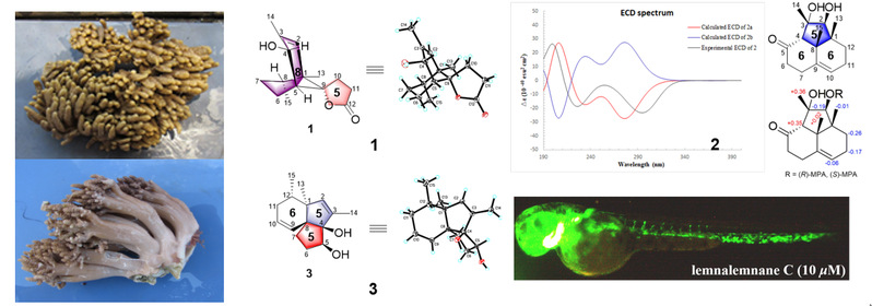 2. 珊瑚中活性先导新骨架化合物的发现与研究 三种新骨架倍半萜lemnalemnanes A−C发现于西沙群岛软珊瑚Paralemnalia thyrsoides和Lemnalia sp.,提出的生物合成途径认为三种新骨架分子起源于共同的前体已知分子,为后续的深入研究提供了科学依据。三个分子具有复杂的稠螺环结构,组合运用了单晶x射线衍射分析(Cu Kα), Mosher方法,ECD量子化学计算等技术确定了其绝对构型。对模式动物斑马鱼模型,新骨架分子lemnalemnanes A-B表现出良好的抗炎活性,lemmnemnane C 在体内表现出较强的促血管生成活性。