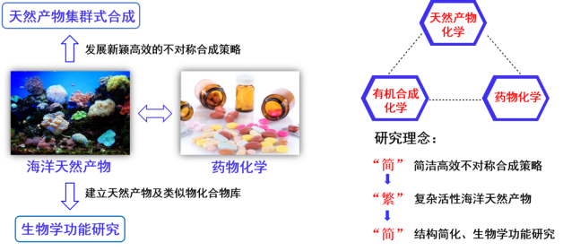 如何高效获得结构多样的天然产物,是新药筛选长期面临的难题。天然产物全合成为解决这一重要科学问题提供了途径。课题组以活性天然产物全合成为核心研究方向,以天然产物的集群式合成为研究特色,希望发展新颖高效的合成策略,实现复杂活性天然产物合成。通过建立天然产物及类似物库,进行结构改造和生物学功能研究。