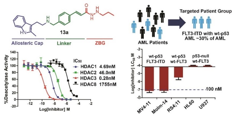 根据目前HDAC抑制剂的不足,李晓杨副教授课题组和美国南卡罗莱纳C. James Chou教授课题组结合目前临床上活性最好的HDAC抑制剂panobinostat的结构,改造其螯合基团异羟肟酸为酰肼,设计合成了一系列化合物。代表性化合物13a的酶活及对AML的细胞活性均在低纳摩尔级,并且在亚型选择性、药代动力学性质及安全性上较先导化合物均有明显提升。另外,13a结合HDAC1和HDAC3的变构位点,为变构抑制剂。抗白血病机制研究发现,13a的抗肿瘤活性具有FLT3和p53依赖性,在wt-p53 FLT3-ITD MV4-11细胞中,13a抑制FLT3通路,下调促凋亡蛋白c-Flip和XIAP,引发细胞凋亡;而在wt-FLT3或 p53-null 细胞中,13a则没有上述作用。以上研究成果4月22日发表于药物化学顶级期刊《Journal of Medicinal Chemistry》上,全文链接https://pubs.acs.org/doi/10.1021/acs.jmedchem.0c00442。李晓杨副教授为第一作者,李晓杨副教授和美国南卡罗莱纳C. James Chou教授为共同通讯作者,海洋药物教育部重点实验室副教授江余祺为共同第一作者,青岛海洋生物医药研究院徐同强为合作作者。