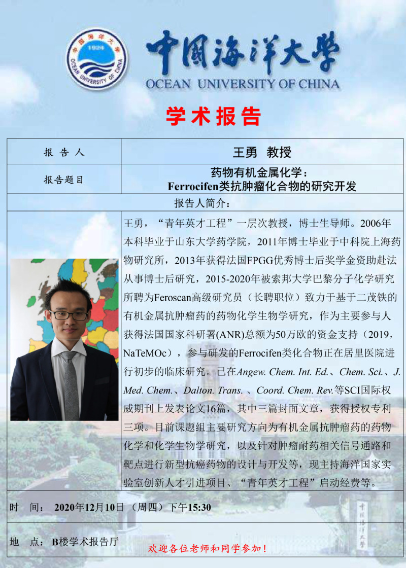 报告题目:药物有机金属化学:Ferrocifen类抗肿瘤化合物的研究开发