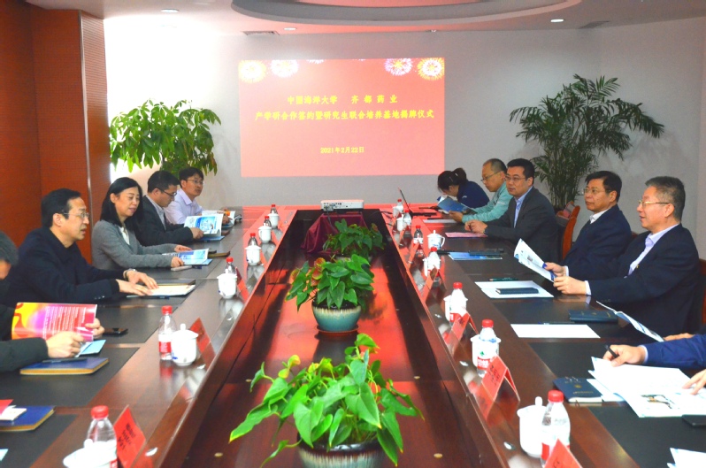 2月21-22日,开云电竞网址海洋药物教育部重点实验室与山东齐都药业有限公司产学研合作签约暨“研究生联合培养基地”揭牌仪式在淄博市山东齐都药业有限公司总部举行。海大医药学院党委书记王震、山东齐都药业有限公司董事长郑家晴到会讲话并为基地揭牌,医药学院院长吕志华、齐都药业公司总经理张建礼分别代表双方签署协议。海大研究生院培养办主任刘海波、医药学院副院长李春霞、李德海、顾玉超,齐都药业公司高级副总经理臧隽忻、张建勇,药物研究院院长任传杰、副院长张涛以及在齐都药业工作的海大毕业生等出席签约仪式。
