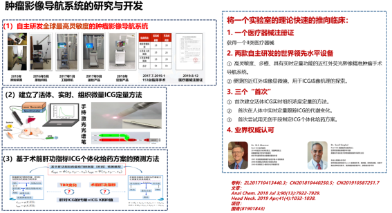 ②基于“微纳”原理的肿瘤精准影像诊断技术及其应用转化 课题组前期参与成功研发、试制了国内首台具有国际领先水平的超高灵敏肿瘤荧光影像导航手术设备(2019年8月12日获得II类医疗器械上市许可,苏械注准20192060927),打破了欧美垄断,并利用其药理学的背景,围绕临床开展了一系列基础科研工作,制定了技术配套的方法学和标准,解决了该技术临床应用的若干关键问题,为该技术推广和发展奠定了基础,也得到了学界和业界的高度关注和认可。2016年起,该设备列为国家科技部十三·五重点攻关项目,其后三次被列入江苏重点研发计划项目,一次江苏工信厅关键核心技术攻关任务。获得了如诺贝尔奖得主W.E.Moerner等生物成像权威的高度评价,并受邀参加了江苏发展大会、临床荧光技术国家年度会议等成像领域国内外高水平会议。