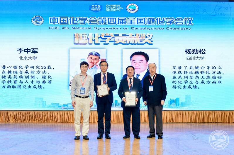 管华诗院士(右一)和俞飚研究员(左一)为糖化学贡献奖获得者李中军(左二)和杨劲松(右二)颁奖