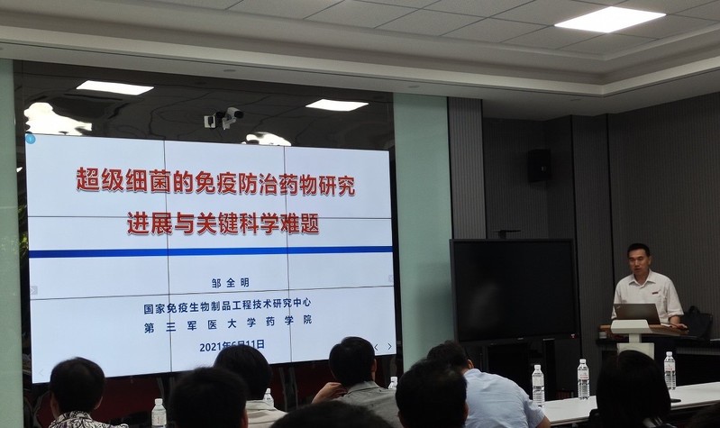 2021年6月11日上午,第三军医大学邹全明教授受邀访问我院,并在药物B楼学术报告厅作了题为《超级细菌的免疫防治药物研究进展与关键科学难题》的学术报告。报告会由于广利教授主持,医药学院师生积极参与本次报告会。
