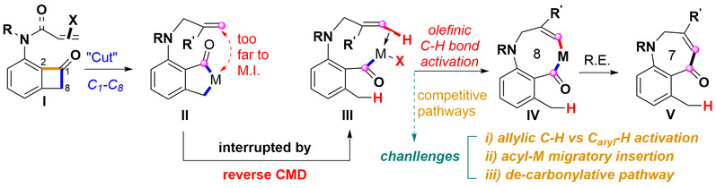 以C-C键活化启动的串联C-C/C-H键活化反应的研究具有极大挑战性:相较于C-C键活化,过渡金属催化的C-H键活化更为普遍且相对容易(从轨道最大交叠的可能性而言),因此优先的C-C键活化相对困难;导向基团仍然是目前实现选择性C-C键活化的必要因素;芳基和烷基C-H键数量更多,相对于烯烃的C-H键来说,对Ar-H活化也更具有更低的活化能垒。到目前为止,无导向基的串联C-C/Colefin-H键活化研究领域仍是空白,新颖的串联反应亟待开发 (图1)。