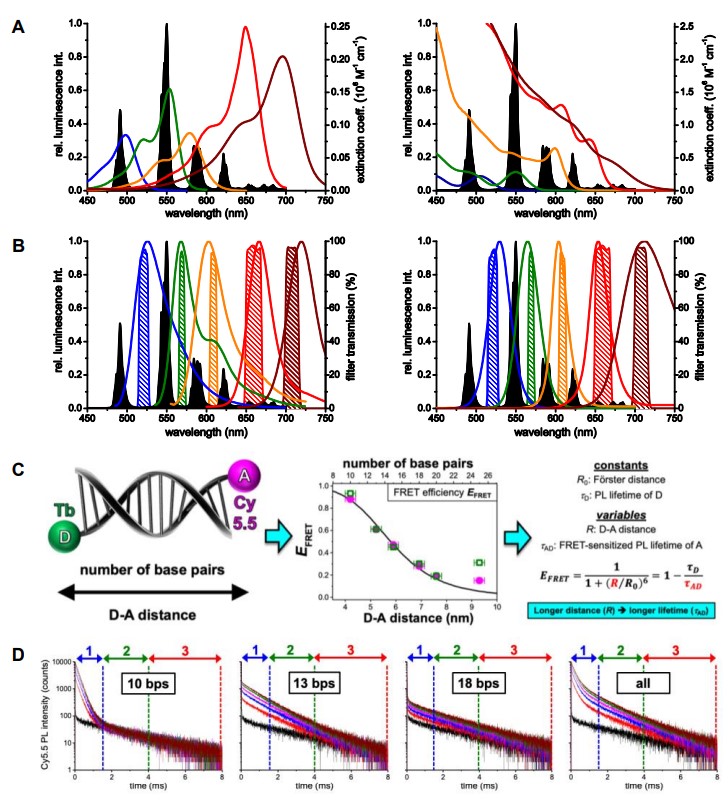 图2. 铽配合物、小分子荧光染料和量子点的吸收(A)和发射光谱图(B);FRET效率和距离的关系(C);不同距离下的荧光衰减曲线(D)