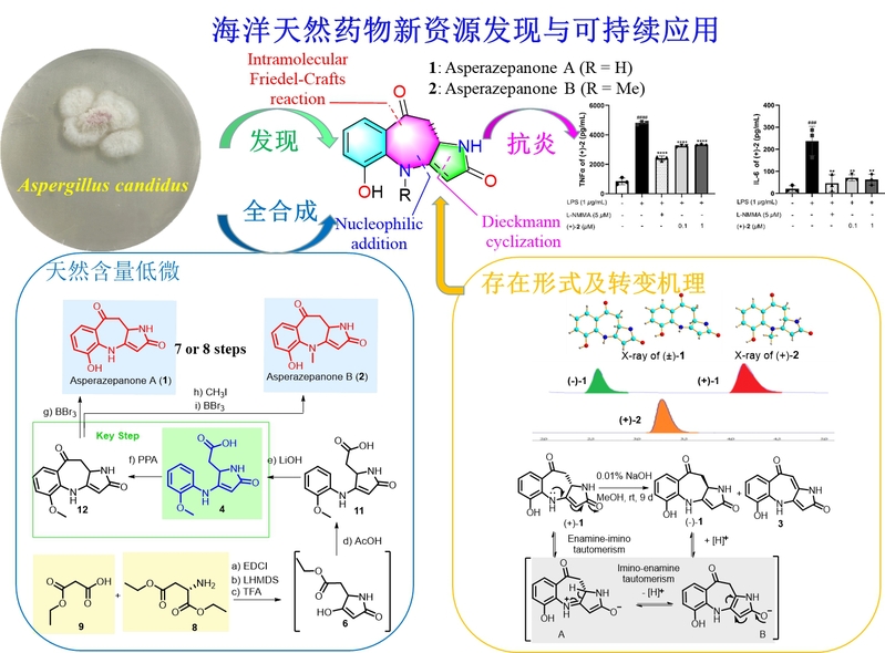 海洋天然产物已被证明是原创新药研发的重要资源。从海洋药源微生物中寻找具有显著药理活性的先导分子,则展现出重要的研究价值和应用潜力。研究团队聚焦国家开发重大创新药物的战略需求,长期从事海洋天然药物先导化合物的发现与优化研究。从一株海洋来源真菌Aspergillus candius中发现了两个具有6/7/5环系的新骨架生物碱(±)-asperazepanone A和(+)-asperazepanone B。综合运用现代波谱、高分辨质谱、CD光谱和X单晶衍射等技术,完整解析上述两个化合物的精确结构。在研究过程中,意外发现(±)-asperazepanone A以消旋体形式存在,而(+)-asperazepanone B则以光学活性方式存在。经过团队系统研究证实,(+)-asperazepanone A是真正海洋真菌来源的天然产物,而其对映异构体(−)-asperazepanone A则是在发酵分离过程中形成的人工产物,相关的消旋机理也得到了推导与验证。