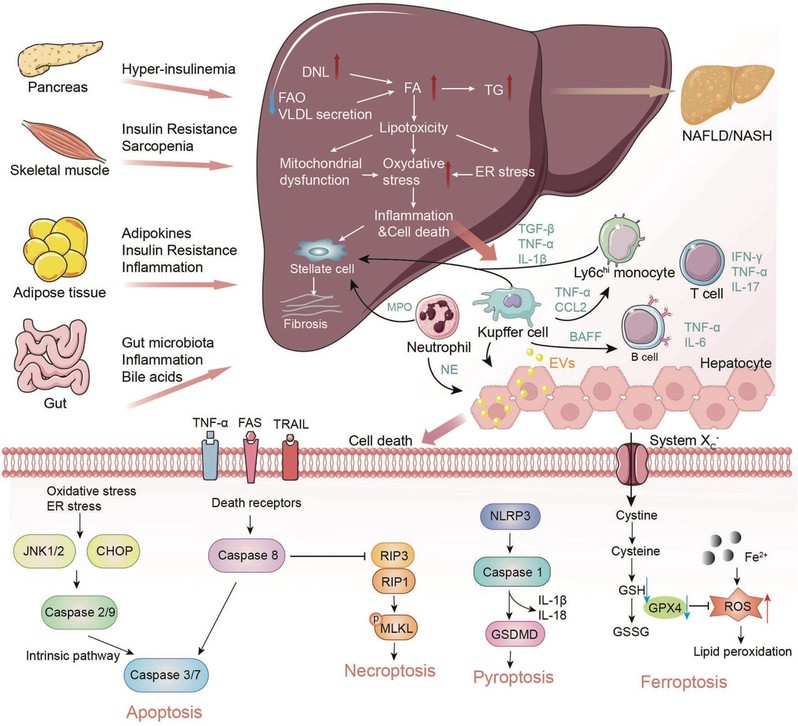图1. NAFL/NASH的发病机制和器官间串扰概述