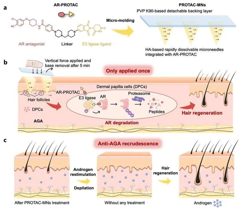 雄激素源性脱发(AGA)是一种在全球范围内跨人种、跨性别的疾病,目前其发生具有少龄化的趋势,严重影响患者的身心健康,但缺乏有效的治疗手段。雄激素受体(AR)与雄激素的结合与AGA的发生发展密切相关目前已被公认,近年来靶向降解雄激素受体的PROTAC化合物已被用于大量与AR信号通路有关的疾病治疗,但其成药性差、分子量大及溶解性差的特性限制其被开发用于透皮递送治疗脱发。因此本研究设计制备了一种载有靶向降解雄激素受体的PROTAC的微针贴片(PROTAC-MNs),通过微针刺入皮肤形成的微孔道直接将药物递送至毛囊周围,阻断雄激素与受体结合及其下游信号通路治疗AGA。