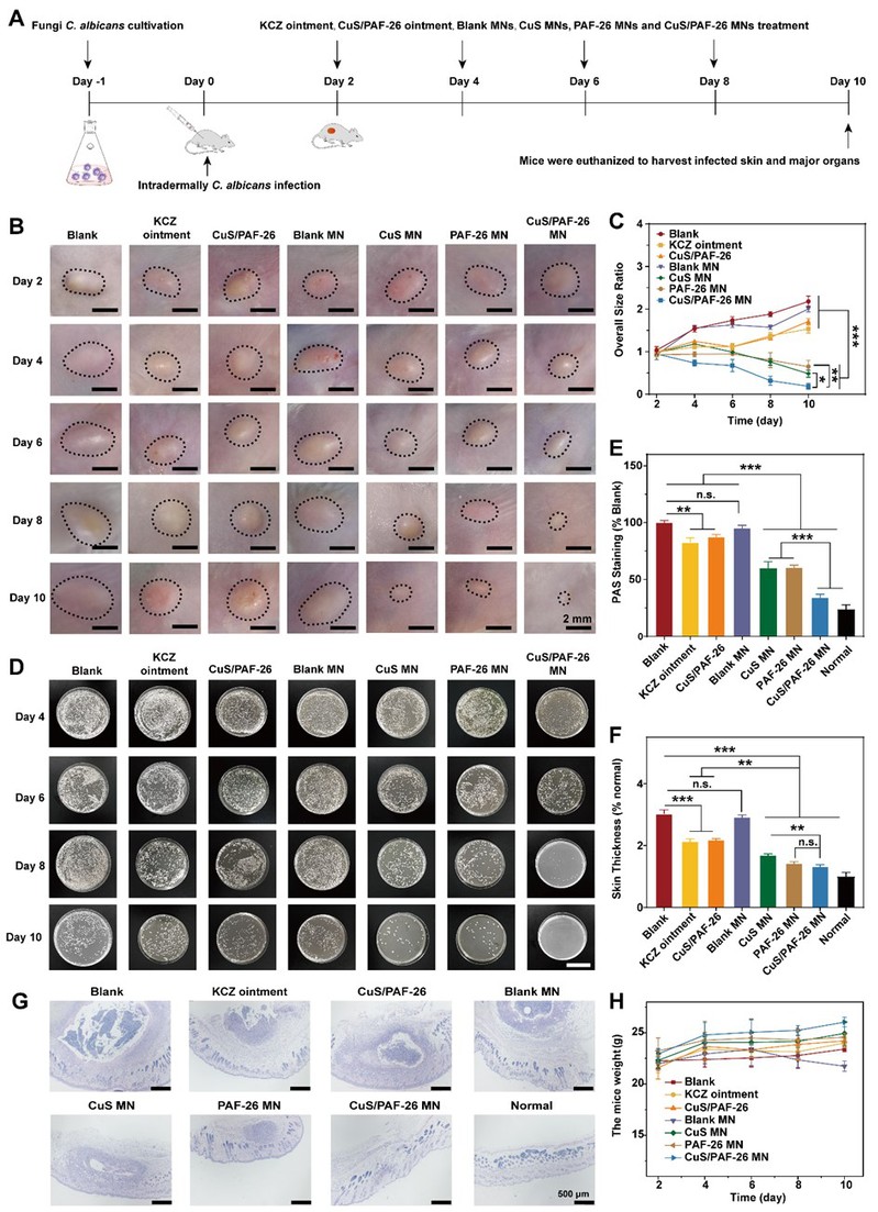 图3:CuS/PAF-26 MN的体内抗皮肤深层真菌感染效果。(A)皮肤深层真菌感染动物模型构建及给药示意图。(B)采用酮康唑(KCZ)乳膏、CuS/PAF-26针尖材料、空白微针、CuS MN、PAF-26 MN和CuS/PAF-26 MN治疗后,不同时间点真菌感染部位图像。(C)不同制剂治疗后真菌感染结节大小的变化。(D)不同制剂治疗后,不同时间点各组小鼠感染皮肤组织体外真菌培养图像,比例尺: 50 mm。(E)不同治疗组与对照组的PAS染色统计图。(F)不同治疗组给药后皮肤厚度(与正常皮肤比)。(G)给药结束时感染小鼠和正常小鼠PAS染色皮肤的组织学图像。(H)不同制剂在不同时间给药后小鼠的体重变化。