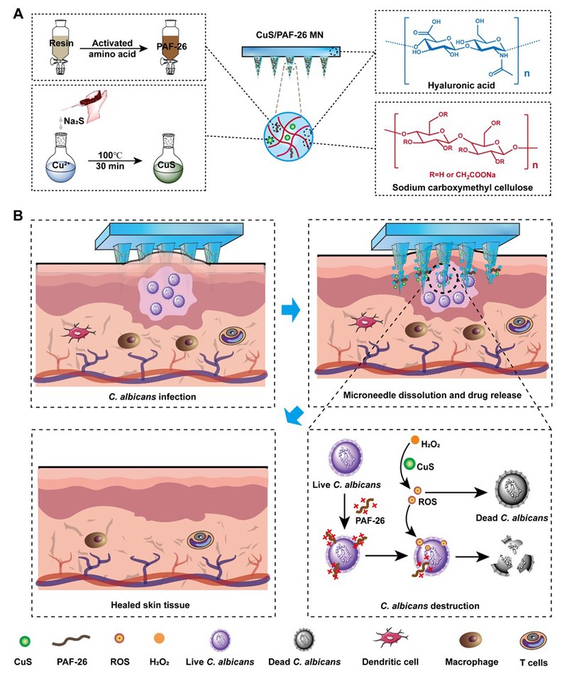 图1:CuS/PAF-26 MN的制备以及治疗皮肤深层真菌感染示意图。(A)采用模具法制备CuS/PAF-26 MN。(B)CuS/PAF-26 MN插入皮肤后快速溶解,持续释放CuS NE和PAF-26有效杀灭真菌。CuS NE通过催化H2O2生成活性氧(ROS)与PAF-26通过破坏真菌细胞膜协同实现抗真菌作用。