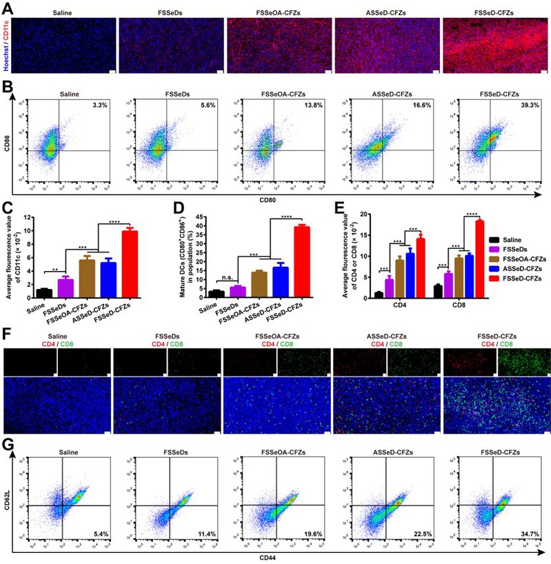 图4. FSSeD-CFZs增强抗肿瘤免疫应答。(A)肿瘤切片中DC(CD11c+)的免疫荧光图像。比例尺,50µm。(B)成熟DC的流式细胞术分析。(C)免疫荧光染色CD11c+ DC,(D)流式细胞术成熟DC,(E)免疫荧光染色CD4+或CD8+T细胞的定量分析。(F)肿瘤切片CD4+或CD8+T细胞的免疫荧光图像。比例尺,50µm。(G)脾脏记忆T细胞CD44+/CD62L-的流式细胞术分析。
