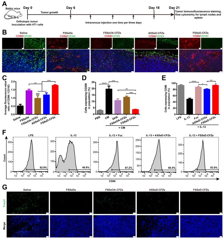 图3:FSSeD-CFZs解除M2-TAM免疫劫持作用。(A)体内免疫机制考察给药示意图。(B)肿瘤组织切片中M1巨噬细胞(CD86+)和M2巨噬细胞(CD163+)的免疫荧光图像。比例尺,50 µm。(C)M1与M2巨噬细胞的荧光比值。流式细胞术半定量分析(D)CD206+ M2巨噬细胞和(E)CD86+ M1巨噬细胞。(F)体外CD86+M1巨噬细胞的流式细胞术分析。(G)肿瘤组织切片中Treg(Foxp3+)的免疫荧光图像。比例尺,50 µm。