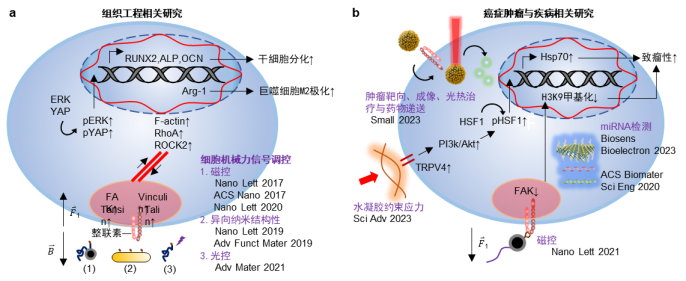 王博士对于探索细胞与微环境之间的动态相互作用很感兴趣,这些相互作用可以对细胞内信号调控和重塑微环境的生物材料的物理化学特性起到重要的生物贡献。为了研究这种微观的现象,他和团队开发了各种仿生纳米生物材料和纳米复合水凝胶,通过机械力或生物化学途径调节相关信号通路,促进了特定的细胞培养和生长。为了实时观察细胞反应,王博士还开发了基于光学技术(如AIE)的多功能纳米探针,用于体内外检测。此外,这些多功能纳米探针可以实现药物递送用于疾病治疗,如癌症治疗和免疫治疗。