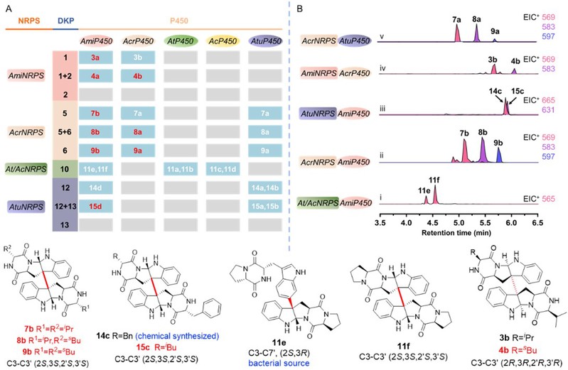 研究人员首先以报道的真菌DKP二聚化酶为靶点,通过blast及SSN分析构建了真菌P450的序列相似性网络,揭示了一类可能专一负责二聚化反应的P450酶。其中有20个P450与一个双模块的非核糖体肽合成酶(nonribosomal peptide synthetase,NRPS)在基因簇上是连锁的,推测可能负责di-DKPs的生物合成。将假定的DKP二聚化P450酶进行进一步的进化树分析,结果显示这些P450分为三支,可能负责催化不同二聚化模式的生成。为了确认这一假设,研究人员分别从三个分支中选取了5个基因簇在模式菌株构巢曲霉中进行了异源表达,结果显示:Clade I(AmiP450)负责催化C3-C3' (2S,3S,2'S,3'S)连接的生成;Clade II(AcrP450)负责催化C3-C3' (2R,3R,2'R,3'R)连接的生成;Clade III(AtP450,AcP450,AtuP450)主要负责催化非对称型二聚化方式的形成(图2)。以上研究通过基因挖掘鉴定了5个区域及立体选择性不同的P450二聚化酶,包括8种连接方式,其中有2种为新的连接方式(C3R-C3′R, C3R- C8′),另外6种与细菌共有;并首次报道了催化含D型氨基酸DKP为天然底物的P450酶(AcrP450和AtuP450);同时分离鉴定了5个新的di-DKP生物碱(3a, 4a, 8a, 9a, 11d)和2个之前是细菌 (11b, 11c)途径来源的产物。这些结果表明了P450催化二聚化模式与其在进化树的分支是一致的。为进一步拓展di-DKP的结构多样性,利用组合生物合成构建了五个基因簇的非天然表达途径,分离到了9个与天然途径不同的二聚体,其中有5个为新化合物(4b, 7b, 8b, 9b, 15c)、2个之前仅从细菌(14e)或者化学合成(14c)途径获得(图3);同时揭示了P450催化DKP二聚化的模式也受到底物的影响。