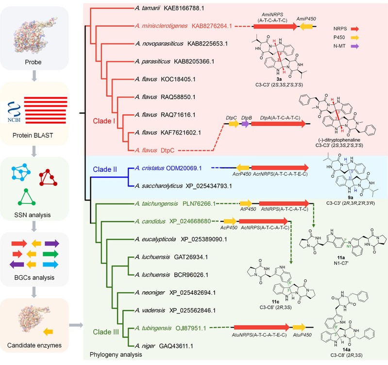 图2. 真菌负责DKP二聚化P450的生物信息学分析及对应的二聚化模式