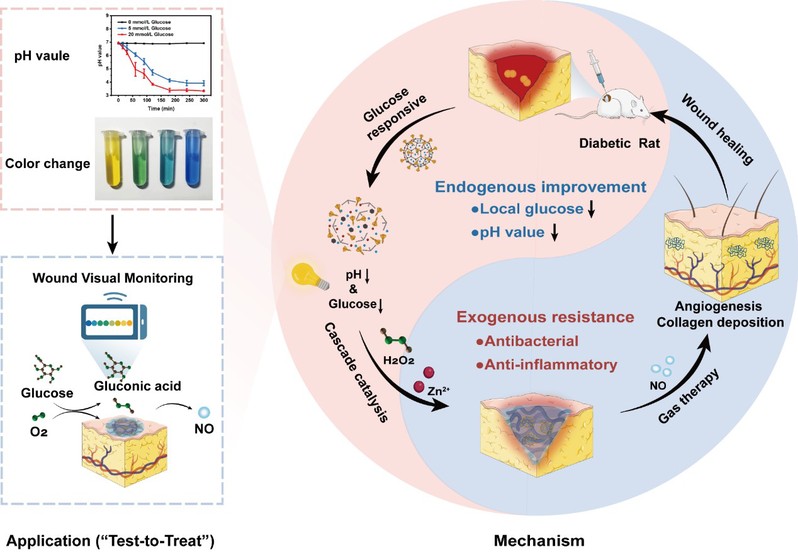 该研究基于内源性改善(降低葡萄糖和pH)和外源性抵抗(抗菌和抗炎)相结合的“安内攘外”策略,为糖尿病伤口水凝胶敷料的开发提供了新的思路。另外,AZG-Gel应用于创面时的pH变化特性,有望制备成“比色创可贴”实现糖尿病伤口的“可视化”治疗(图2)。 相关成果最近以“A Zn-MOF-GOx-based Cascade Nanoreactor Promotes Diabetic Infected Wound Healing by NO Release and Microenvironment Regulation”为题,发表于《Acta biomaterialia》(IF=9.7,TOP期刊)。开云电竞网址医药学院2021级硕士研究生相广丽为该论文第一作者,赵峡教授为通讯作者。