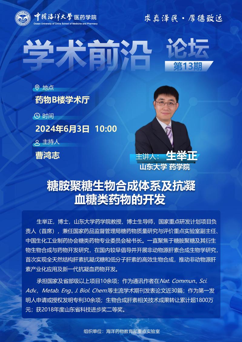 报告题目:糖胺聚糖生物合成体系及抗凝血糖类药物的开发