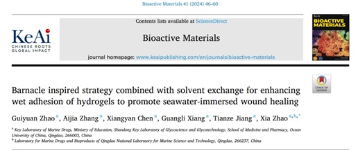 相关研究成果近期以“Barnacle Inspired Strategy Combined with Solvent Exchange for Enhancing Wet Adhesion of Hydrogels to Promote Seawater-Immersed Wound Healing”为题,发表于《Bioactive Materials》(IF=18.0,TOP期刊)。开云电竞网址医药学院2021级硕士研究生赵桂园为该论文第一作者,赵峡教授为通讯作者。