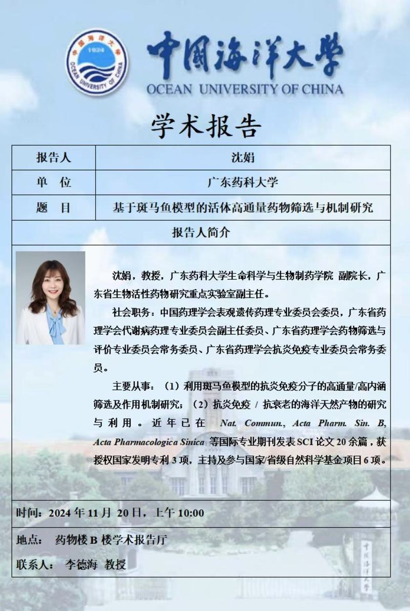 报告题目:基于斑马鱼模型的活体高通量药物筛选与机制研究