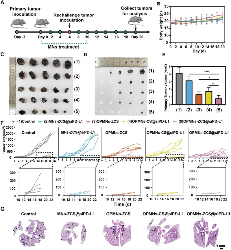 图2:OPMNs-ZCS@siPD-L1在体内的抗肿瘤免疫治疗效果。A) 肿瘤再挑战模型的构建和药物给药示意图。B) 20 d治疗期间各组小鼠的体重变化。C) 治疗20 d后各组原发肿瘤的数码照片,1) 对照组,2) MNs-ZCS@siPD-L1组,3) OPMNs-ZCS组,4) OPMNs-CS@siPD-L1组,5) OPMNs-ZCS@siPD-L1组。D) 各组再挑战肿瘤的数码照片。E) 不同制剂处理后肿瘤的重量。F) 20 d治疗期间各组原发肿瘤和再挑战肿瘤的体积变化曲线。G) 不同制剂处理后小鼠肺的苏木精和伊红染色图像(黑色箭头:转移灶)。