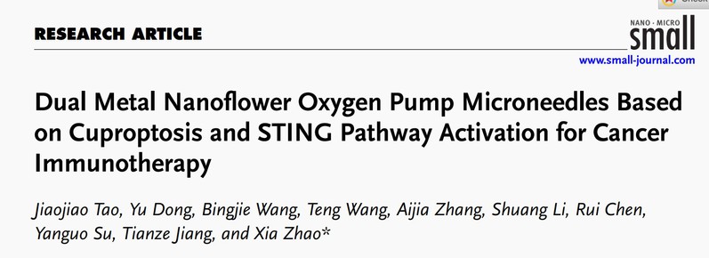 相关研究成果近期以“Dual Metal Nanoflower Oxygen Pump Microneedles Based on Cuproptosis and STING Pathway Activation for Cancer Immunotherapy”为题,近日发表于《Small》(IF=13.0,TOP期刊)。开云电竞网址医药学院2022级博士研究生陶娇娇为该论文第一作者,赵峡教授为通讯作者。