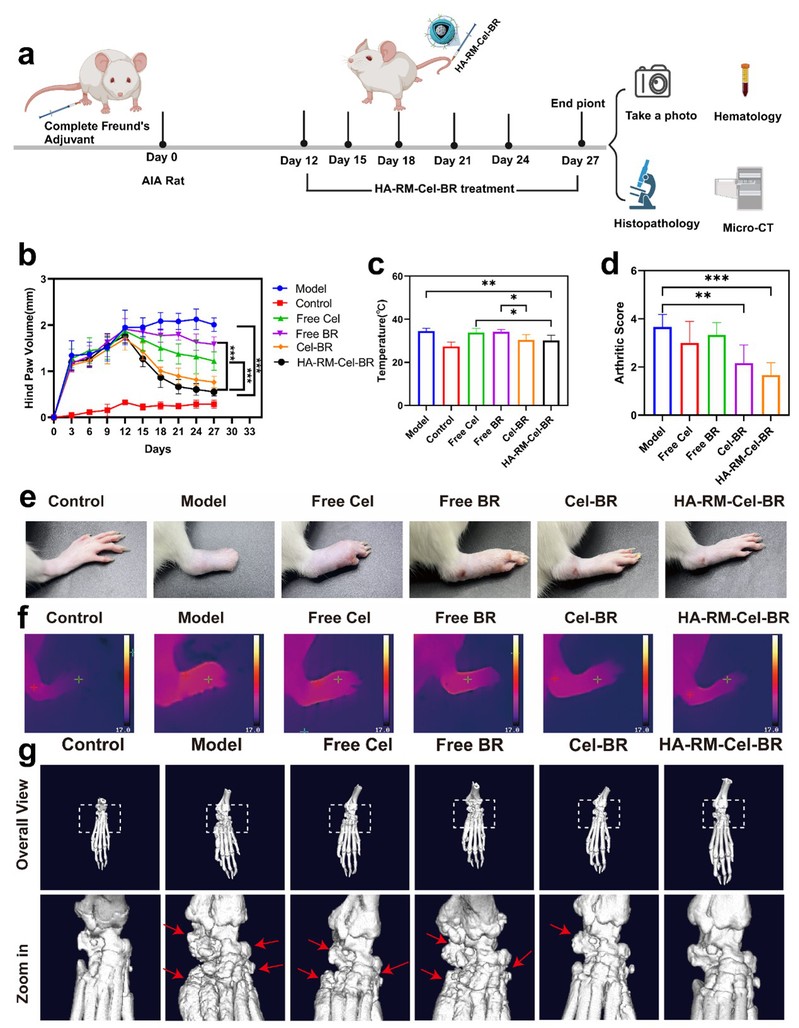 图2:HA-RM-Cel-BR对RA的体内治疗作用。(a) RA大鼠模型的建立及治疗方案。(b)不同治疗组足趾肿胀程度。(c, f)热成像测得的炎爪温度。(d)不同治疗组关节炎功能评分。(e)不同治疗组炎症关节照片。(g)不同治疗组骨组织显微计算机断层扫描(micro-CT)分析
