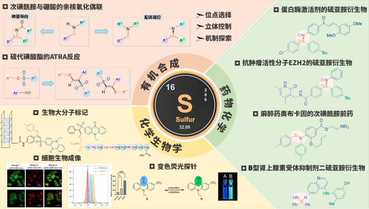 本课题组的研究方向主要分为硫化学以及DNA化学生物学两个方面。在硫化学方面,本课题组基于Chan-Lam偶联在硫亚胺和亚砜亚胺等新颖药效团构建与应用方面做出了系统性的工作,提出由次磺酰胺合成硫亚胺的新思路,发展了外加配体调控Chan-Lam偶联化学选择性与对映选择性的新策略,建立了无外加氧化剂下Chan-Lam偶联的新范式,并将其开发成为多肽药物后期修饰以及蛋白标记的新颖工具;也发展了可以响应细胞内氧化活性物质水平的含硫变色荧光探针ESAC,将其成功标记到穿膜肽、核酸适配体等功能生物大分子中,实现了细胞内成像研究。在化学生物学方面,以DNA识别为中心,我们设计并合成了一系列吡咯-咪唑多肽分子(PIP),通过分子间氢键高亲和力和特异性结合错配的碱基对,开发用于治疗癌症的肽类抗癌药物,并利用PET等技术研究其代谢、分布等重要药学问题。