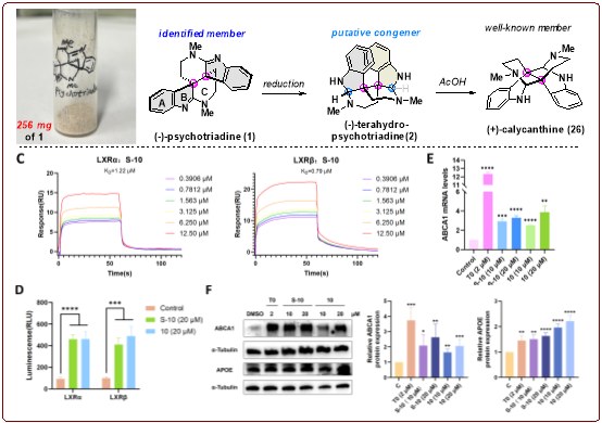 研究团队从简单原料色胺出发,仅需12步即可高效完成256毫克天然产物(−)-Psychotriadine的对映选择性全合成,通过X射线晶体学分析确定其绝对构型,为解析天然Psychotriadine的构型提供了关键依据。此外,研究团队进一步通过立体选择性还原合成了生物同源物Tetrahydropsychotriadine,证实了同系物的可及性和生源假说。由于物质本身难以获取,导致Psychotriadine及其同系物的生物活性研究从未被涉足,研究发现合成中间体S-10与10能够作为高效的肝X受体(LXRs)激动剂,显著上调ABCA1和APOE的蛋白表达水平,展现出作为治疗阿尔茨海默症药物先导化合物的良好潜力。