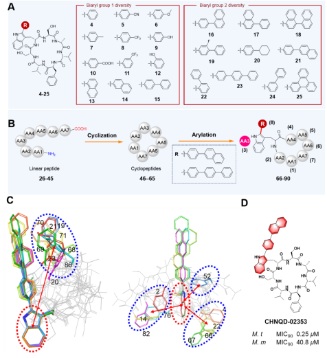 在versicomycin新颖骨架灵感启发下,研究团队设计并合成构建了一个环七肽化合物库,重点探索色氨酸吲哚环C-2位不同结构芳基取代及环肽骨架氨基酸残基对活性的影响。通过海分枝杆菌(Mycobacterium marinum)替代模型(与结核分枝杆菌基因组同源性高,培养周期短,病理特征类似),对该类化合物的抗结核活性、构效关系(SAR)、构象效应以及体外和体内抗菌效果进行了系统评价。