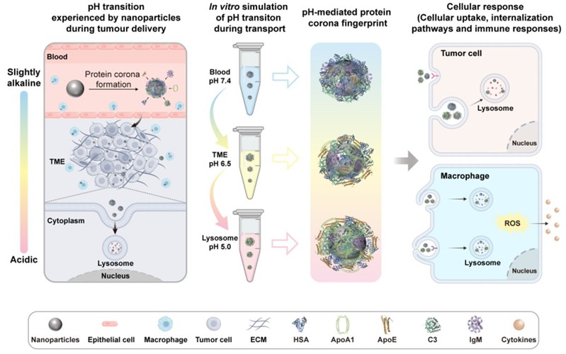 纳米药物在体内递送过程中不可避免地与血液蛋白相互作用,形成的“蛋白冠”显著影响其在体内的分布及免疫反应。目前研究主要聚焦于纳米颗粒理化性质对蛋白冠的影响,但体内复杂且动态变化的生理微环境如何调控蛋白冠演化仍缺乏系统研究。纳米颗粒从血液(pH 7.4)进入肿瘤组织(pH≈6.5),再到细胞内溶酶体(pH 4.5-5.5)的过程中,pH的持续变化会影响蛋白质在颗粒表面的吸附、解离及构象转变,进而驱动蛋白冠的动态重塑。研究发现,在酸性环境下颗粒表面蛋白吸附量显著增加并伴随蛋白构象展开,促进了巨噬细胞(RAW264.7、dTHP-1)和肿瘤细胞(A549)对纳米颗粒的摄取(图1)。蛋白组学分析显示,酸性条件下蛋白冠中补体C3和免疫球蛋白含量下降,而调控性蛋白C4BPA及载脂蛋白(ApoA1、ApoE)富集,这一组成变化在增强细胞内吞的同时显著抑制了ROS生成与炎症因子(IL-1β、TNF-α、IL-6)的分泌,实现了“高摄取、低炎症”的双重调控效应。该研究系统阐明了pH驱动的蛋白冠动态重塑机制,及其对免疫识别和细胞互作的深远影响。