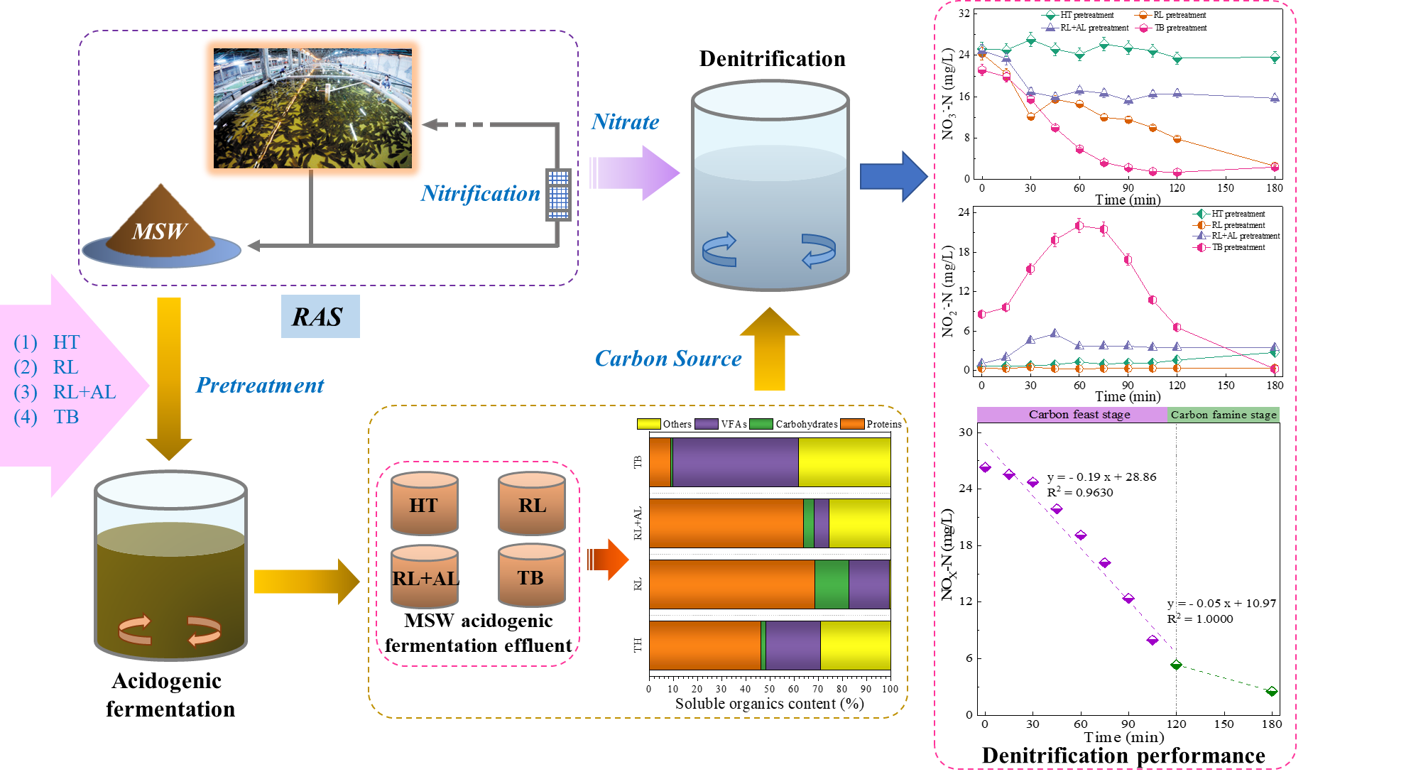 本研究结果表明,鼠李糖脂和嗜热菌预处理过的MSW产酸发酵液具有良好的反硝化效果,NO3--N去除效率高达97%,出水中的亚硝态氮(NO3--N)浓度低于0.4 mg/L。嗜热菌处理过的MSW产酸发酵液驱动的反硝化出水COD浓度(35 mg/L)远低于其他组(200mg/L以上),这与嗜热菌处理过的MSW产酸发酵液中较高的挥发性脂肪酸含量(52.1%)密切相关。嗜热菌处理过的MSW产酸发酵液中易生物利用的有机碳源(SS)含量高达74.5%,这表明发酵液中有效碳源充足,因此在NOX-N的去除过程中只观察到了carbon feast stage和carbon famine stage两个阶段,而内源反硝化阶段未观察到。