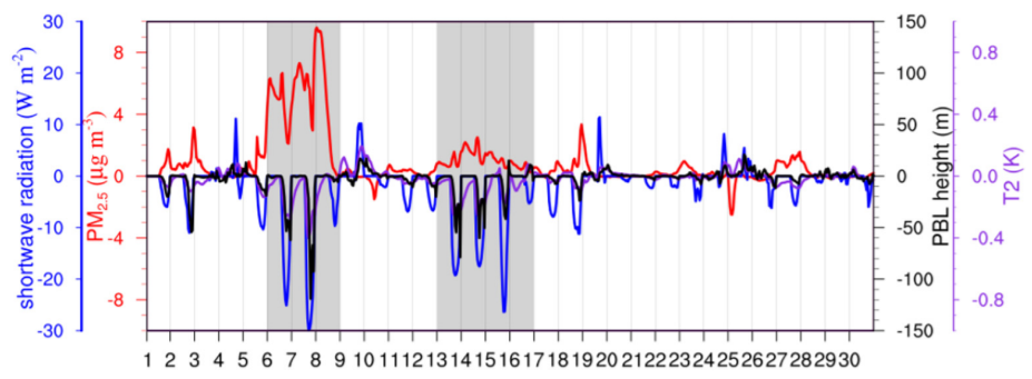 该研究是第一项系统地调查大型野火和气溶胶直接效应对美国东南部地区空气质量影响的研究。在这项研究中,我们发现在2016年11月发生的两起野火事件中,野火对美国东南部地区PM2.5浓度的贡献率达到45%。此外,本研究阐明了气溶胶直接效应主要是通过减少到达地面的短波辐射通量,降低了2米温度和大气边界层高度,从而促进了PM2.5浓度的进一步积累,并且定量分析发现在2016年11月6 - 8日,气溶胶直接效应导致PM2.5浓度进一步提高了10% - 14%。