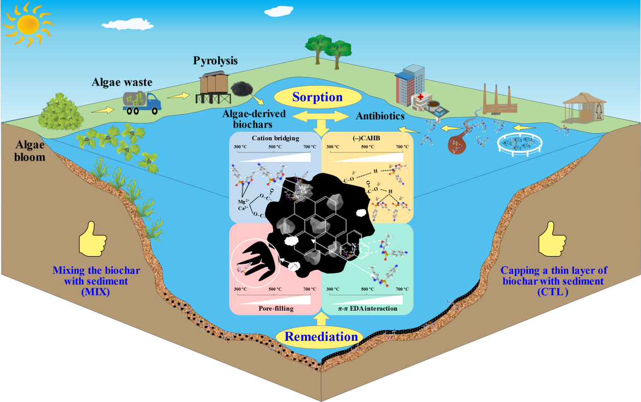 水产养殖在全球粮食安全和脱贫方面发挥着至关重要的作用。集约化海水养殖中抗生素的过度使用导致其在养殖水体和沉积物中持久性富集,对非靶标生物产生生态毒性,诱导细菌产生耐药性,对近海生态系统产生严重危害。因此,开发近海环境中抗生素的污染阻控和原位修复技术,是确保近海水质安全和生态系统健康的重要保障。生物炭具有改善土壤性质、增加土壤碳固存能力、缓解温室气体排放、修复污染水体和土壤/沉积物等功效。水体富营养化导致大规模的藻华和赤潮在世界范围内频繁发生,其产生的藻类生物质的资源化利用是亟待解决的难题。然而,以海藻废弃物为原料制备的生物炭(ABCs)在分子水平上的化学结构与陆生植物生物炭的差异尚不清楚。在复杂水化学条件的海水环境中,ABCs对抗生素吸附的效果和机制尚也不明确。此外,仅有少量研究报道了ABCs在难降解有机物(如多环芳烃、酚类化合物、邻苯二甲酸酯)污染的沉积物修复中的应用,但对海洋沉积物中抗生素等可解离化合物的修复尚未见研究报道。因此,该研究利用浒苔和废弃海藻渣两种海洋藻类废弃生物质为原料在不同热解温度(300~700 ºC)下制备ABCs,表征其分子水平上的化学结构,探究其对海水养殖环境中典型抗生素磺胺甲恶唑(SMX)的吸附性能和机制,评估其对受SMX污染的海洋沉积物的修复效果。本研究旨在评估ABCs修复海洋环境中抗生素污染的可行性,研究成果将有助于扩大生物炭的原料供应及其在环境修复中的应用范围。