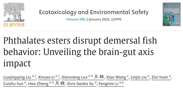 近日,开云电竞网址郑浩教授与罗先香教授团队在Ecotoxicology and Environmental Safety上发表了题为“Phthalates esters disrupt demersal fish behavior: Unveiling the brain-gut axis impact”的研究论文(DOI:10.1016/j.ecoenv.2024.117470)。在新污染物问题日益突出的时代,邻苯二甲酸酯类(PAEs)塑化剂等传统污染物在海洋环境中的持续释放和长期残留也严重威胁到“One Health”目标的实现。尽管PAEs的内分泌干扰效应已得到了广泛的研究,但其在环境相关浓度下诱导的海洋鱼类神经行为毒性效应和潜在机制尚不清楚。因此,本研究从行为生态毒理学的视角明确了环境相关浓度下PAEs诱导海洋鱼类焦虑样症状的神经行为毒性,并揭示了“脑-肠”轴调控鱼类神经行为的潜在机制。本研究采用“新”的行为生态毒理学方法评估了海洋传统遗留污染物的生态风险,为“海洋健康”背景下海产养殖环境中PAEs生态风险的早期预警监测提供了新思路。