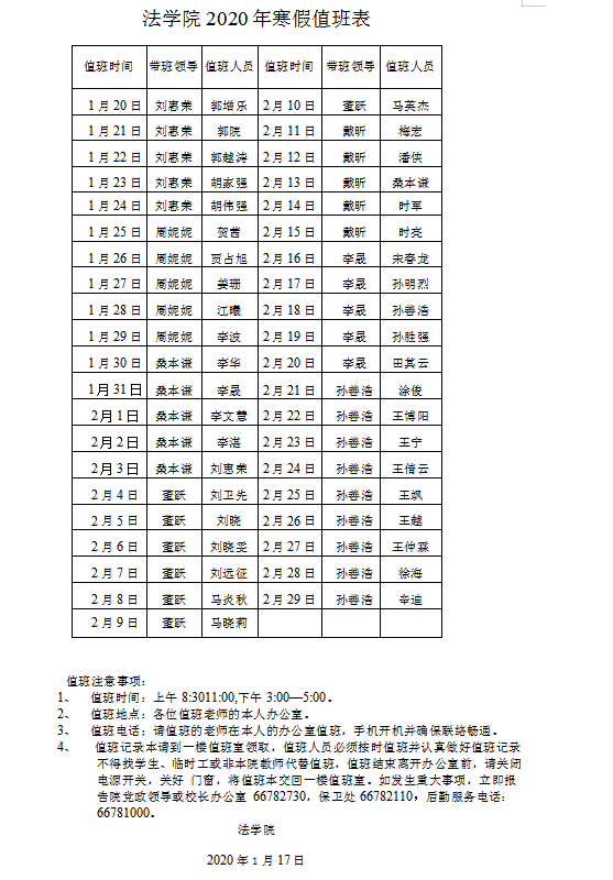 法学院2020年寒假值班表