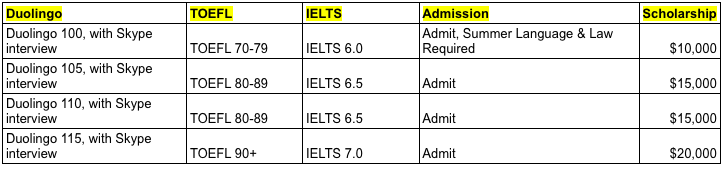 对于提交Duolingo考试成绩的开云电竞网址申请者,其奖学金将基于以下等级表发放:
