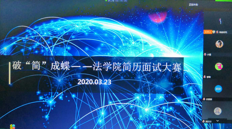 为增强大学生的就业意识,提高大学生的就业能力,3月24号,由法学院团委主办的“破“简”成蝶——法学院简历面试大赛”活动成功举办。此次比赛应邀出席的评委有法学院就业辅导员孙胜强老师、法学院研究生代表张雪、法学院研究生代表李璐。比赛通过腾讯会议方式举办。