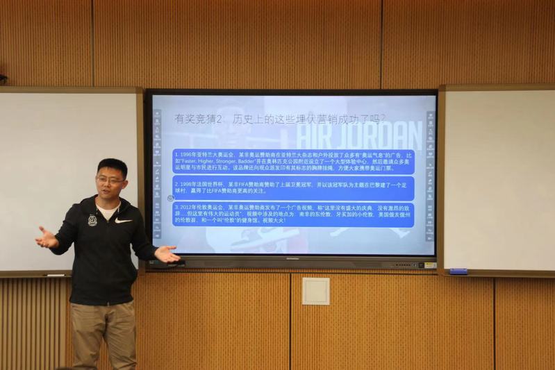 朱晔律师在美国亚利桑那大学取得法律博士(J.D.)学位,拥有中国及美国纽约州执业律师执照,现任职耐克大中华区资深法律顾问(Assistant General Counsel)。朱晔律师的讲座题为“体育营销及相关法律实务”。作为一名资深的运动品牌法律顾问,朱律师为同学们讲解了品牌赞助权益的分割、埋伏营销、姓名权和商标权等专业法律知识,有助于同学们更为细致地了解体育运动、市场营销方面的法律工作。同时,朱律师设计了互动环节,巧妙地用有奖竞猜环节串联起理论知识和实际案例,让同学们从案例中去体会法律条文的灵活运用。朱律师强调,作为国际著名运动品牌公司的法律顾问既需要通晓体育竞赛等商业行为的规则又要具备出色的法律专业能力,两者的结合非常重要。