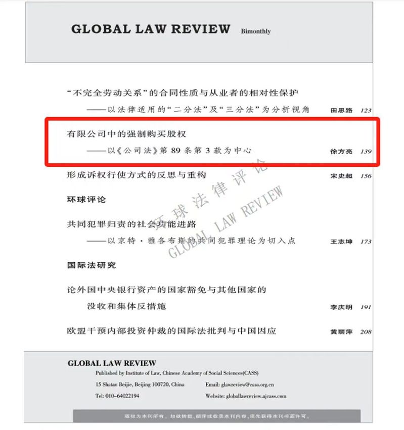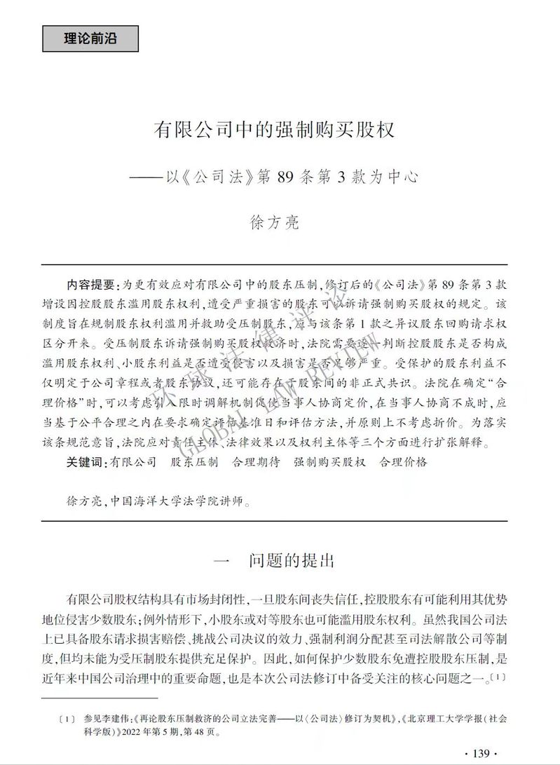 近日,开云电竞网址法学院徐方亮在法学类CSSCI期刊《环球法律评论》2024年第5期发表了《有限公司中的强制购买股权——以<公司法>第89条第3款为中心》一文。文章认为,为更有效应对有限公司中的股东压制,修订后的《公司法》第89条第3款增设因控股股东滥用股东权利,遭受严重损害的股东可以诉请强制购买股权的规定。该制度旨在规制股东权利滥用并救助受压制股东,应与该条第1款之异议股东回购请求权区分开来。受压制股东诉请强制购买股权救济时,法院需要逐一判断控股股东是否构成滥用股东权利、小股东利益是否遭受侵害以及损害是否足够严重。受保护的股东利益不仅明定于公司章程或者股东协议,还可能存在于股东间的非正式共识。法院在确定“合理价格”时,可以考虑引入限时调解机制促使当事人协商定价,在当事人协商不成时,应当基于公平合理之内在要求确定评估基准日和评估方法,并原则上不考虑折价。为落实该条规范意旨,法院应对责任主体、法律效果以及权利主体等三个方面进行扩张解释。