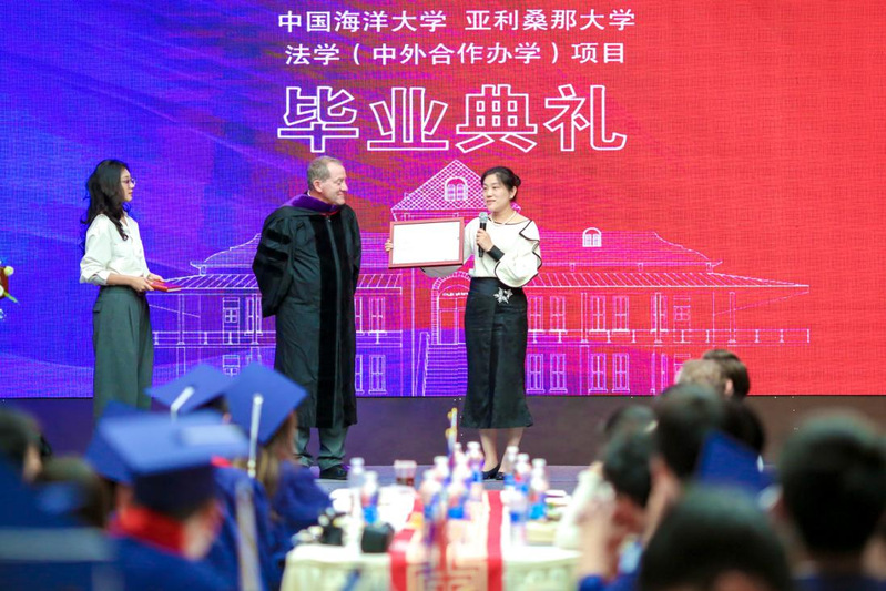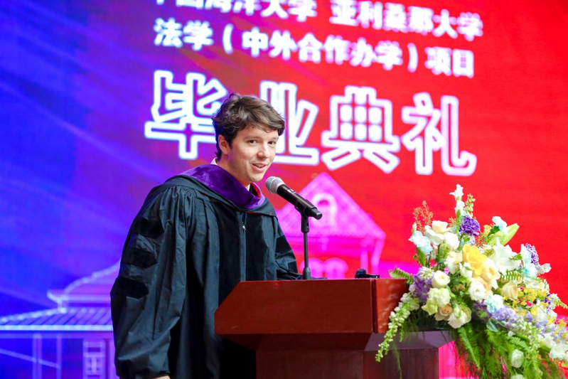 于铭作为中方代表发表了致辞,她表示为中外法项目的毕业生们取得的成就感到自豪,同时她也为中外法项目的发展感到自豪。她提到尽管本届中外法项目学生的求学之路上遭遇过疫情封控,如今学生们又经历着国际关系带来的不确定性,但这些都没有打倒也打不倒也催不垮海大与亚大之间合作的坚实基础。与此同时,她强调中外法项目不断追求教育品质提升离不开中美双方老师以及学生们的共同努力,也离不开家长们的支持和信任。她还对毕业生们寄予殷切期望,希望他们能成为社会的栋梁之材。