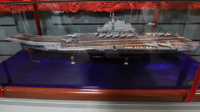 赠品展室展出的“辽宁号”航母和歼-15舰载机模型
