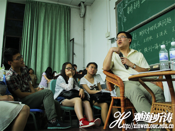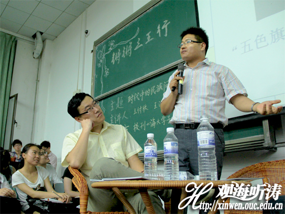 三位“人气王”老师一登场即引爆现场火热气氛,全场掌声雷动。王付欣幽默开场介绍自己与另外两“王”,讲述三人同年来到海大的渊源。阐明之所以选择探讨“时代中的民族性问题”,一方面是因当下暴力恐怖事件与各种独立势力抬头,另一方面也希望通过就各国、各朝代民族政策的介绍与讨论,获得对当今中国民族问题解决的启示。
