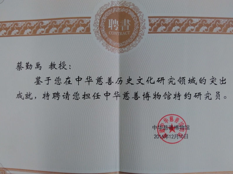 12月10日,中华慈善博物馆特约研究员第一届年会召开,我部教师蔡勤禹教授被聘请为特约研究员。
