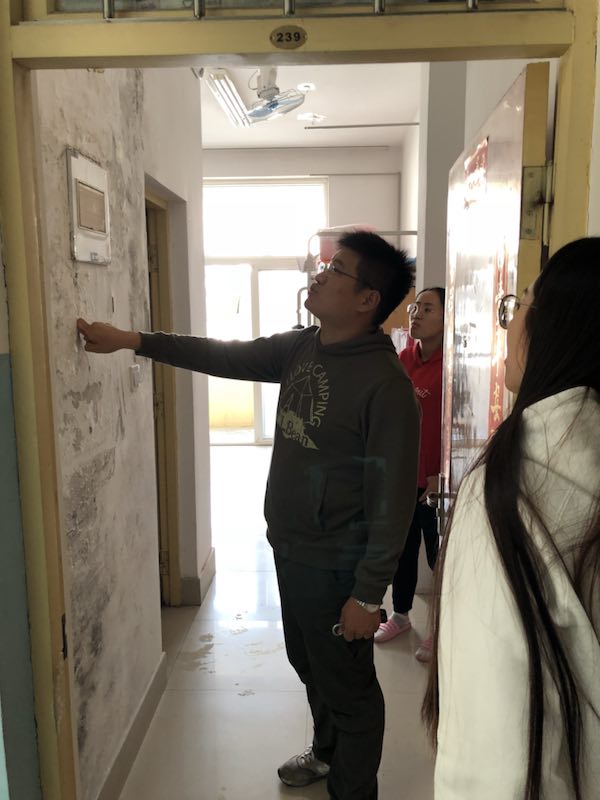 下图为王付欣老师询问239宿舍墙皮脱落情况。